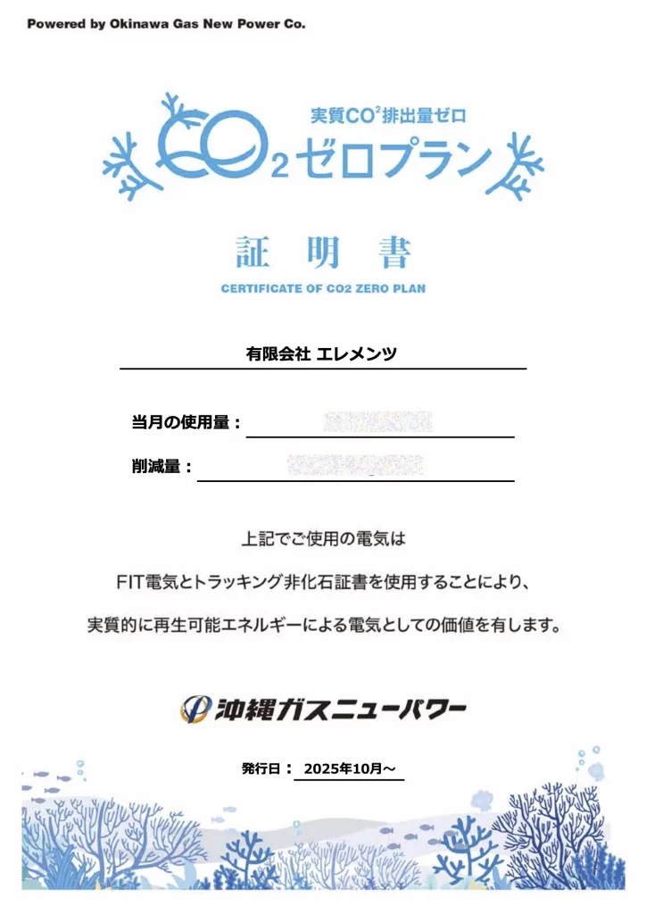 弊社の店舗、事務所、加工場の全ての電力において、CO2排出量がゼロ(再生可能エネルギー100%)になる、地球環境に優しい電力を利用しております。