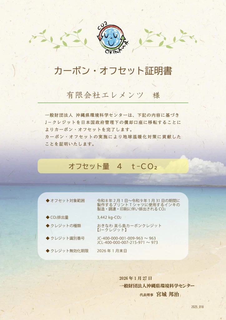 インキの製造、輸入、Tシャツへの印刷に伴い排出されるCO2排出量3.442tをカーボン・オフセットします。